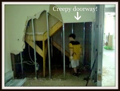 The wall that CX is tearing out is actually going to house our gun safe behind a secret door. Sir just had to have a "secret bookcase" door. Where CX is walking actually used to be the access to the stairwell. It was this super creepy little door. Like the one from the twilight zone...you know the one, where the creepy little creature lives. (EKK!!! Getting chills right now!)